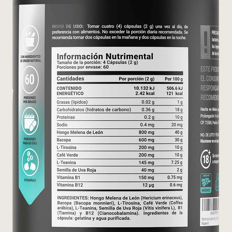 ¡Impulsa tu mente con Clarity Platinum B Life®! Cada cápsula contiene 500 mg de nuestra exclusiva combinación de Hongo Melena de León, Café Verde, Bacopa, L-Tirosina, L-Teanina, Semilla de Uva Roja y Vitaminas B1 y B12. Una poderosa formulación nootrópica que ninguna otra presentación ofrece. Un solo frasco de 240 cápsulas te proporcionará un suministro de hasta 2 meses, siguiendo la dosis sugerida de 4 cápsulas al día, de acuerdo al modo de uso indicado.