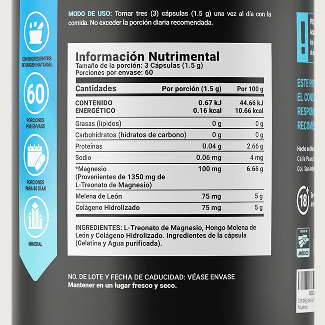 ¡Threonate Mag B Life®, un impulso para tu bienestar! Cada cápsula de 500 mg contiene 100 mg de magnesio, provenientes de 1350 mg de L-treonato de magnesio, melena de león y colágeno hidrolizado, activos claves para tu vitalidad.